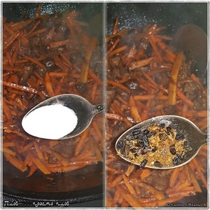 На этом этапе стоит слегка присолить и ложку – полторы специй и приправ добавить. В ложе, что справа смесь для плова. Там: зира, барбарис, перцы, немного шафрана. Если такой смеси под рукой нет, то неполная столовая зиры и барбарис, как минимум, необходим. Но это действие вовсе необязательно.
