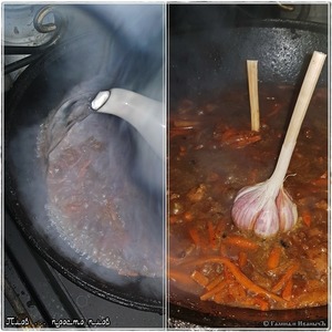 В этот момент в казан отправляется чеснок. Пару – тройку головок. Больше на надо. Головки чистить не надо. Лишнюю шелуху убрать и всякое ненужно снизу очистить.