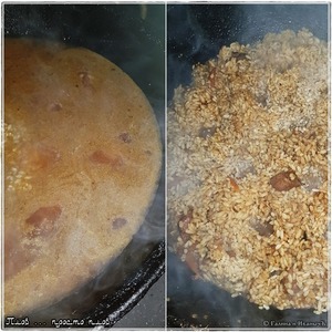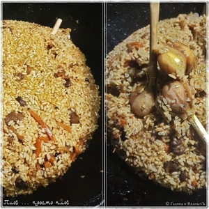 Огонь под казаном минимальный. Вода впитывается в рис довольно быстро. Шумовкой отодвигаете рис от стенок и дна. И оструганной палочкой, толщиной в три карандаша делайте отверстия «до дна», чтобы жидкость зирвачная поднималась через слой риса к поверхности от дна. Рис, чтобы ей пропитывался и набирался ароматов.