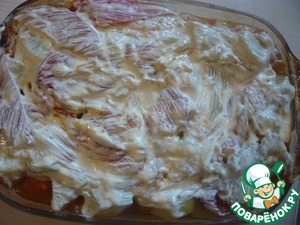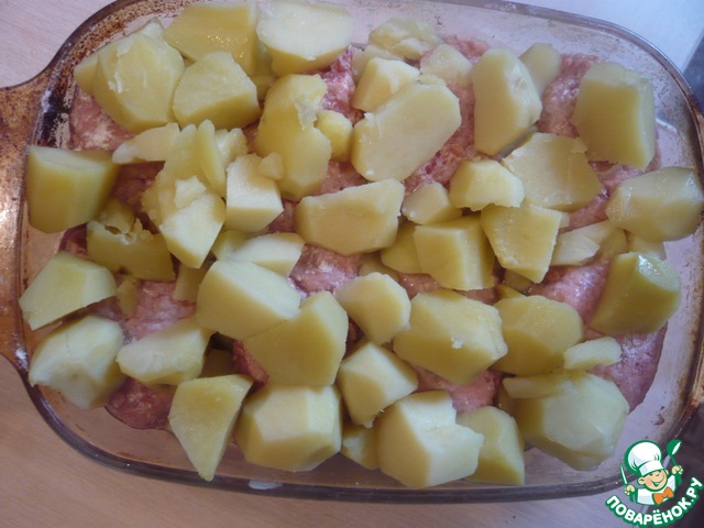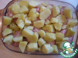 Загружаем сверху картофель. Он у нас уже порезан и отварен.
