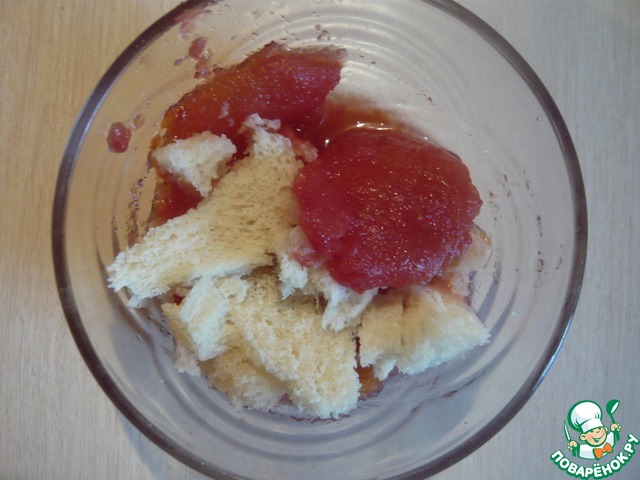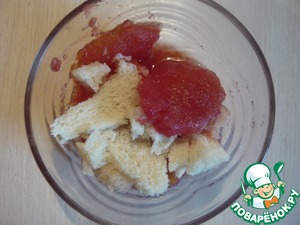 Булочку замачиваем в соленых помидорах и в томатах в собственном соку. Солим, перчим.
