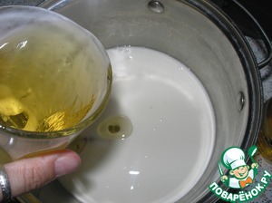 Прежде всего соединяю в кастрюле 2 ст. кефира и 1 ст. растительного масла, немного подогреваю на маленьком огне, добавляю по 2 ч. л. без горки соли и сахара. Тщательно перемешиваю и снимаю с огня.