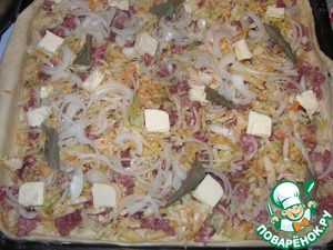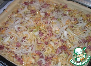 Теперь выкладываю подготовленные капусту с морковью, а сверху нарезанный лук.