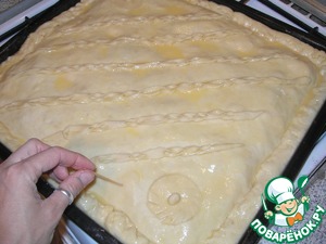 Пока есть немного времени при желании можно приготовить небольшие элементы декора из остатков теста (обычно остаётся, когда укладываешь на противень и обрезаешь лишние края). Декорирую пирог, смазываю взбитыми желтками и с помощью шпажки делаю маленькие отверстия через равные промежутки по всей поверхности пирога для выхода пара.