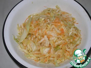 А в это время займусь начинкой. Нашинковать 1/3 вилка капусты, морковь натереть на мелкой тёрке. Хорошенько обмять капусту с морковью, посолить по вкусу. Пока оставляем настаиваться.