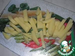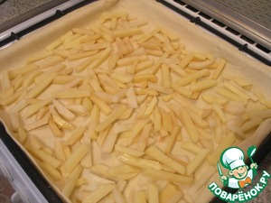 Чищу картофель и нарезаю его крупной соломкой. Пока кладу в воду, чтобы не потемнел.