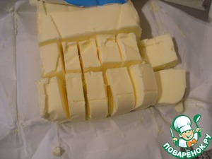 Сейчас необходимо включить духовку на 180 градусов для прогревания. А также достать из холодильника сливочное масло, мне нужна половинка от целой пачки, я нарезаю на средние кусочки, оставляю нагреваться при комнатной температуре.
