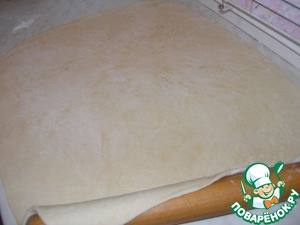 Противень смазать растительным масло и присыпать мукой. Аккуратно перекладываю на него тесто и разравниваю по уголкам.
