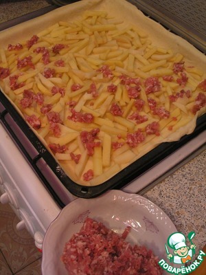 В дело вступает сама начинка: нарезанный картофель достать из воды, обсушить полотенцем и равномерно распределить по всему тесту. -