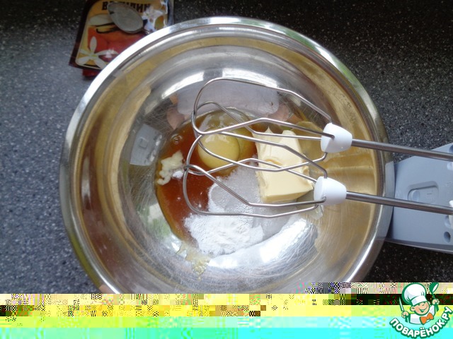 Соединить яйцо с мёдом, сливочным маслом, ванилином, солью и разрыхлителем до однородной консистенции. -