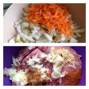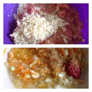 Лук 1 шт нарезать кубиком, морковь натереть на крупной терке. Поставить обжаривать на растительном масле до золотистого цвета. Тем временем в фарш добавить специи. Лук 1 шт натереть на крупной терке, чеснок пропустить через пресс. Вымесить фарш. Рис лучше отварить заранее и остудить.