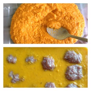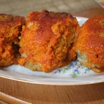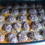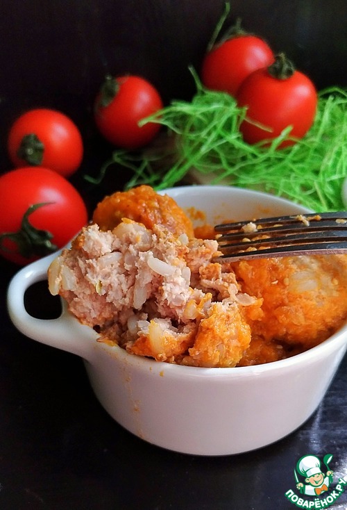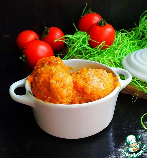 Наши овощи пюрировать погружным блендером. Добавить 200 мл кипяченой холодной воды, кинуть щепотку соли. Хорошо размешать подливу и вылить в форму для запекания. Из фарша сделать небольшие тефтельки и выложить в соус. Отправить форму в духовку при 190-200 гр на 30-40 минут.