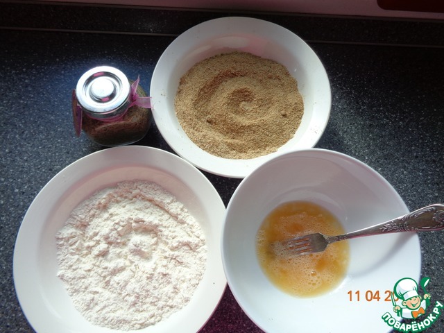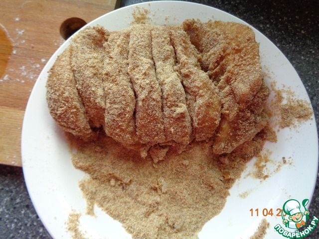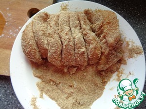 Переносим в панировочные сухари и тщательно обсыпаем филе.
