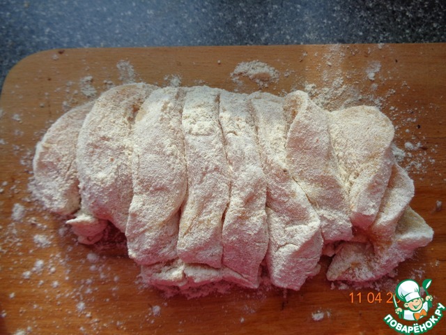 Куриное филе разрезаем поперек, не доходя до другого края, с шагом надрезов в 1 сантиметр.