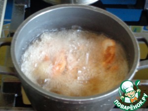 Жарим в закипевшем фритюре по 1 минуте с каждой стороны, процедуру повторяем еще раз с каждой стороны.