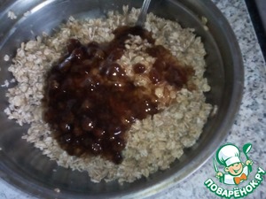 Добавляем любой сироп из варенья, думаю вместо варенья можно сварить сахарный сироп, он нужен для связки геркулеса. Я добавляла вместе с ягодками, т. к изюма было маловато, а кураги и вовсе не оказалось.