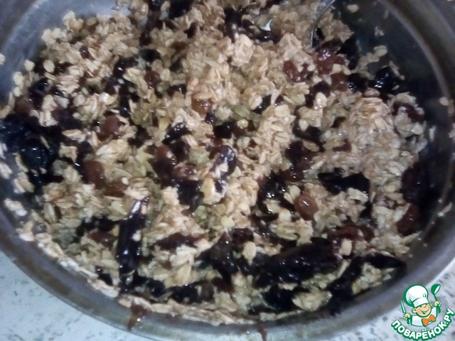 Добавляем промытые, предварительно замоченные изюм и чернослив ( я мелко нарезала), можно курагу или любые другие сухофрукты или ягоды. Хорошо перемешиваем.