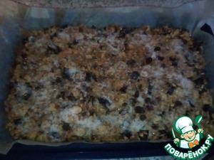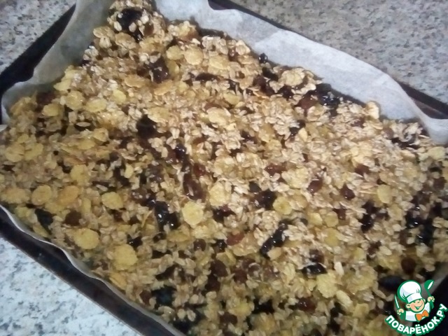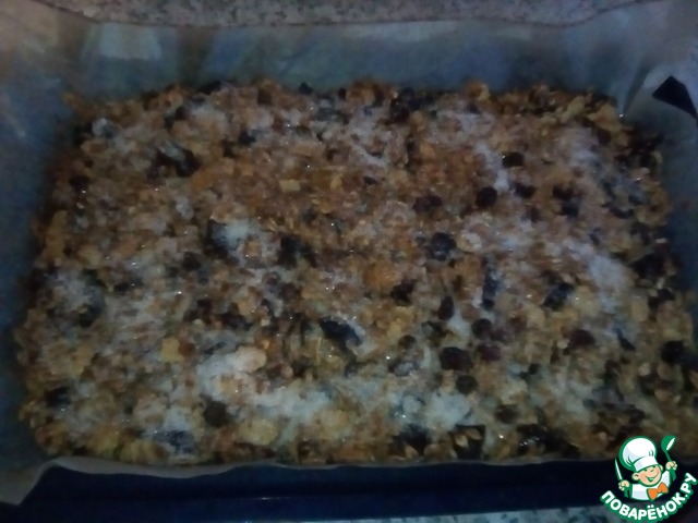 Я в конце сама не знаю зачем засыпала верх сахаром в надежде что получится что то типа корочки, но при такой температуре сахарной корочки не получилось, в общем не повторяйте моих ошибок..))) Если есть желание красиво нарезать на батончики или печенье то лучше делать это в теплом виде, я совершила ошибку в том что остудила, а потом пыталась нарезать, получилось местами только ломать из за сухофруктов, но на вкус это никак не повлияло, только на внешний вид...