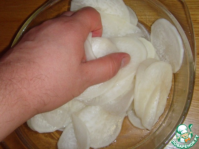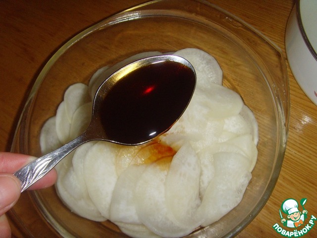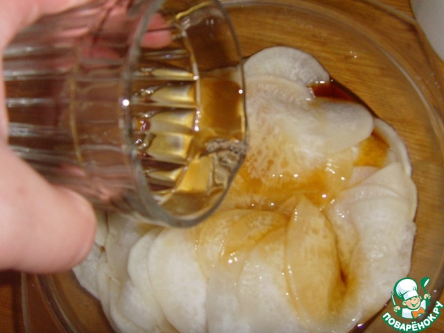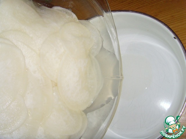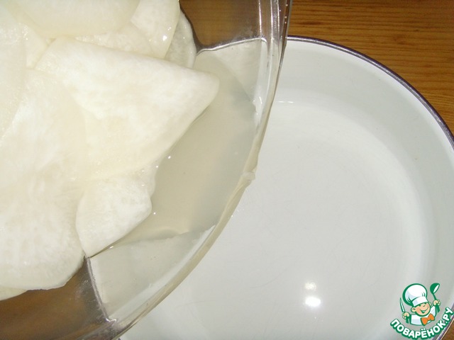 Даём редьке просолиться 15-20 минут. Сливаем рассол.