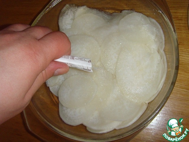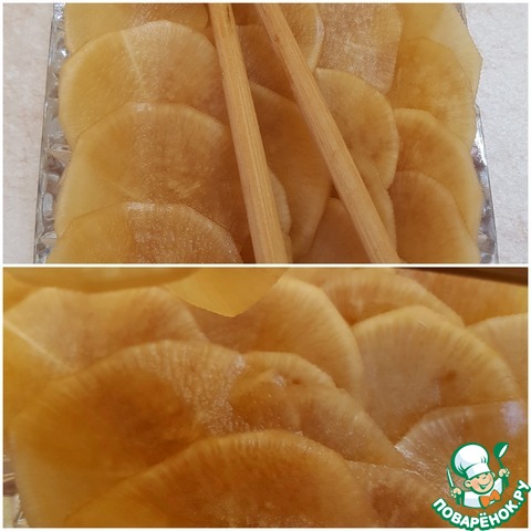 Дайкон моем, чистим, нарезаем поперёк тонкими, круглыми ломтиками.