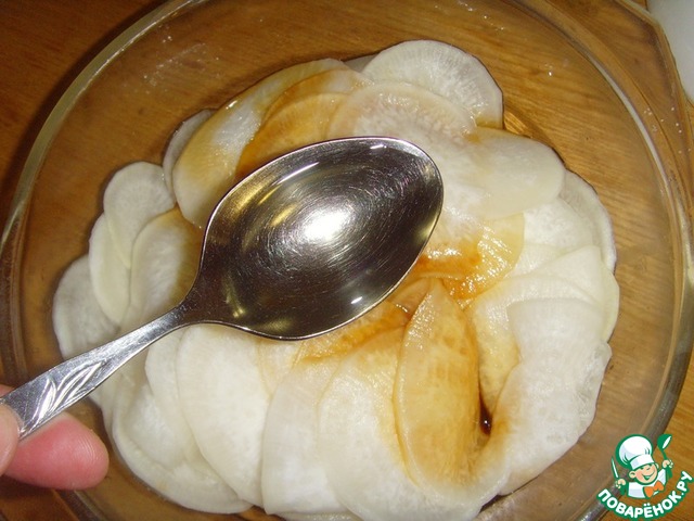 Простая, но вкусная, освещающая, возбуждающая аппетит закуска из белой редьки. Делается легко и быстро из простых продуктов. Может храниться в холодильнике длительное время, и со временем становится только вкуснее.