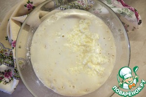 По истечении времени опара подошла, увеличилась в объеме, на поверхности появились пузырики.