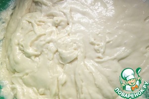 Соединяем опару и взбитую массу. Я смешивала миксером на минимальной скорости.