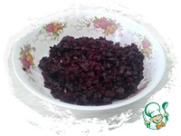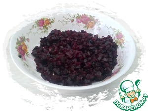 Свеклу отварить с добавлением уксуса, остудить, почистить, нарезать мелким кубиком. |