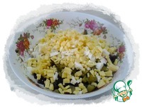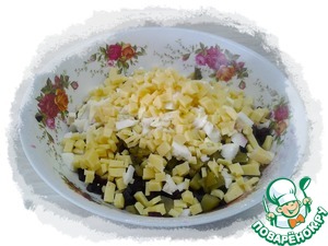 Сыр и отварные очищенные яйца так же нарезать кубиком. |