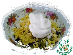 Все продукты смешать в салатнике, добавить соль, перец и майонез.