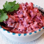 Описание: Всем любителям свеклы хочу предложить ещё один несложный, но очень вкусный салат. От других свекольных салатов его отличает нарезка всех продуктов кубиком.