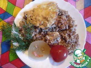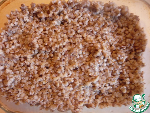 • В смазанную растительным маслом форму выкладываем отваренную гречку.