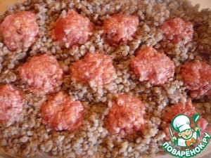• Из фарша формируем биточки и выкладываем их к гречке.