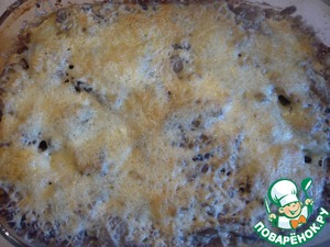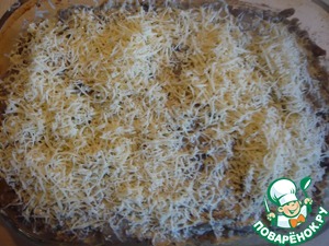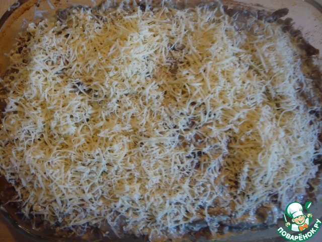• Достаем форму и посыпаем тертым сыром наш шедевр. Отправляем в духовку на 10 мин.
