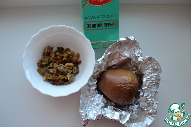 Яблоко запечь в духовке при 180 градусах в течение 20-30 минут до мягкости, остудить. Ориентируйтесь на сорт и размер яблока и мощность своей духовки. Изюм промыть, замочить в воде минут на 30. Слить воду и ещё раз промыть изюм.