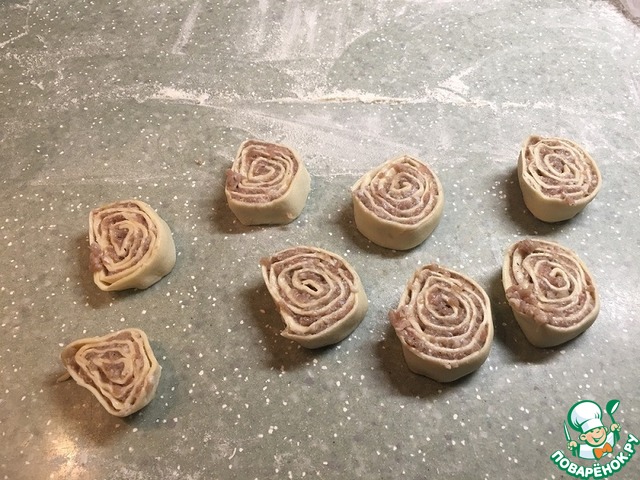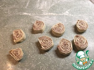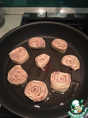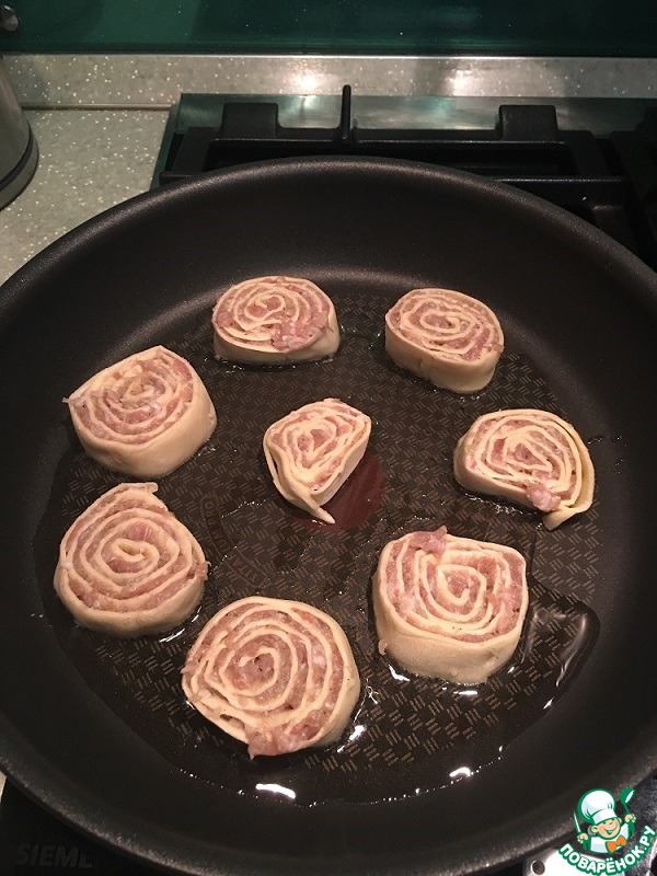 Разогреть сковороду и выложить "розочки". Обжарить на большом огне с обеих сторон.