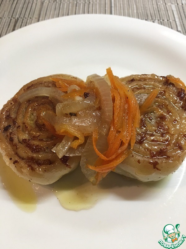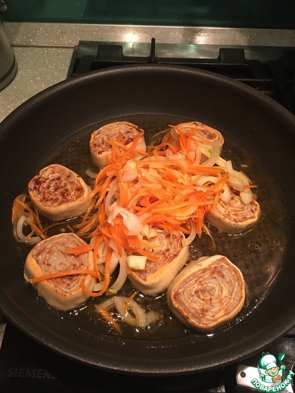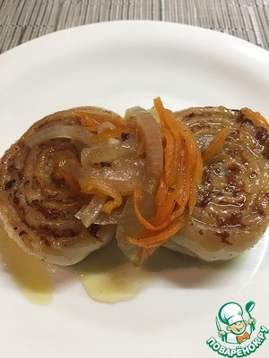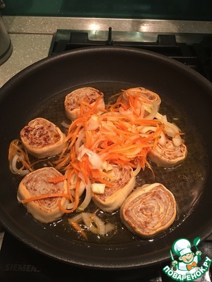 Морковь натереть на терке, лук порезать полукольцами. Выложить в сковороду поверх "розочек".