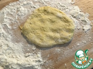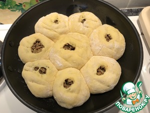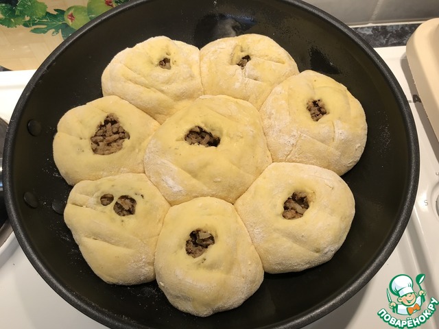 Когда тесто поднялось обминать не надо. Подпылить поверхность мукой, рукой или ложкой положить кусочек теста, разровнять руками, положить начинку, закрепить и швом положить на противень. Я пекла в сковороде.