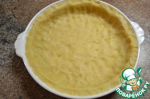 Форму смазываем сливочным маслом и выкладываем тесто, закрывая бортики.