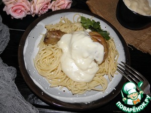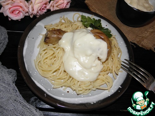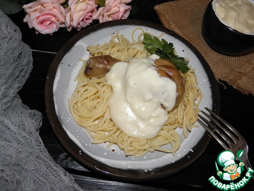Соус по этому рецепту получается не очень жирным в сравнении с вариантами, где используются сливки и твердые сыры. Но при этом вкус остается насыщенным сырно-сливочным. -