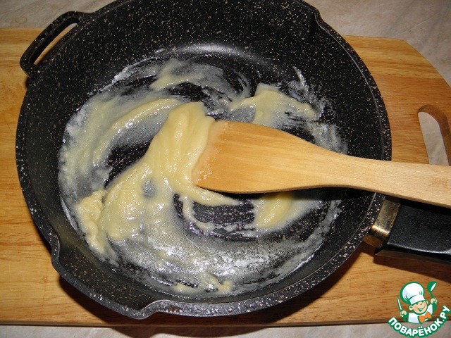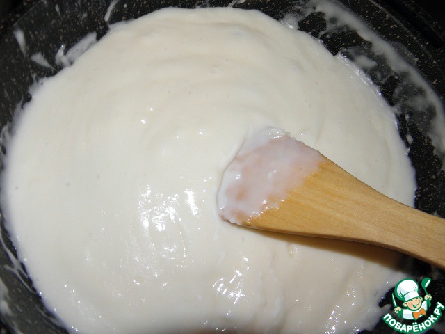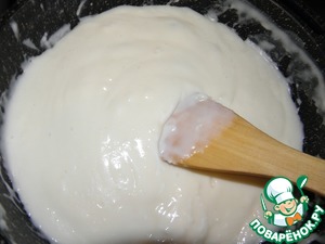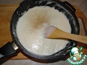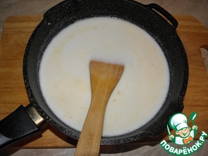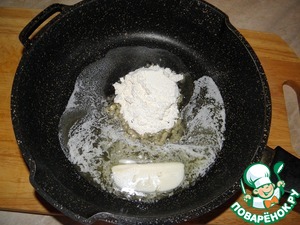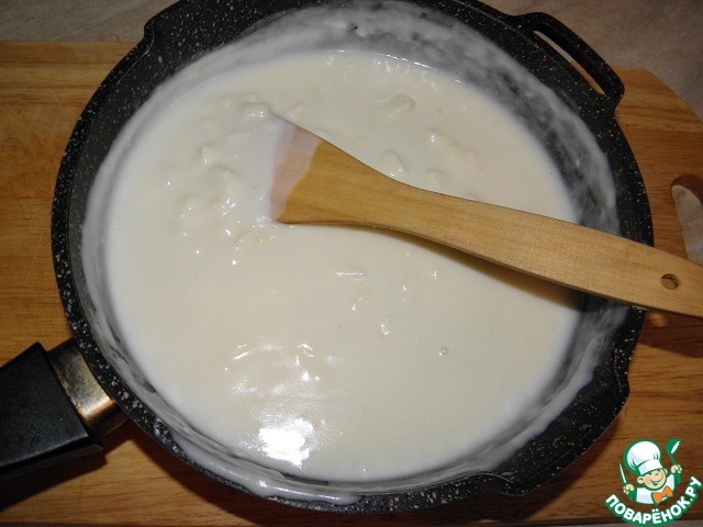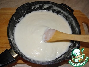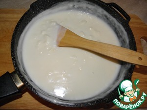 Тонкой струйкой, постоянно помешивая, влить в мучную смесь сначала подогретое молоко, а затем и подогретый бульон. Сначала вливайте по 130 мл., остальное лучше добавить потом по необходимости. Поставить сковороду на средний огонь и варить примерно 3 мин., помешивая, до легкого загустения.