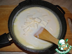 Сыр нарезать кусочками, добавить в соус (если сомневаетесь в качестве сыра, лучше натрите его на терке, чтоб точно растворился)