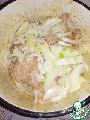Лук чистим, моем и режем полукольцами. Чеснок чистим и пропускает через чеснокодавку. Все тщательно перемешиваем и оставляем мариновать в холодильнике на ночь, ну или минимум на 1 час.