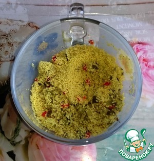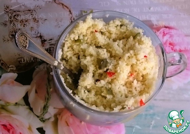 Кус-кус со специями и другими добавками перемешиваем в подходящей посуде. (Кус-кус увеличится по объему при запаривании раза в 2-3.)