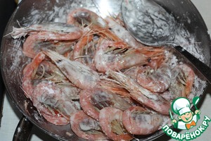 Слить из сковороды большую часть масла и минуту обжаривать креветок, вымоченных в соусе