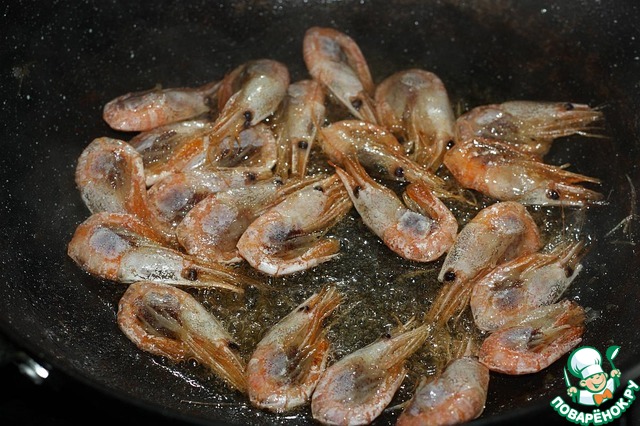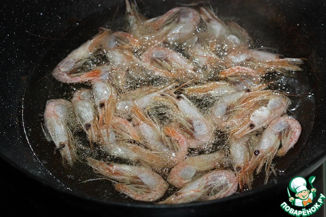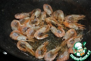 Обжарить креветки в раскаленном масле до хрустящей корочки. Если делаете несколько порций, обжаривайте партиями