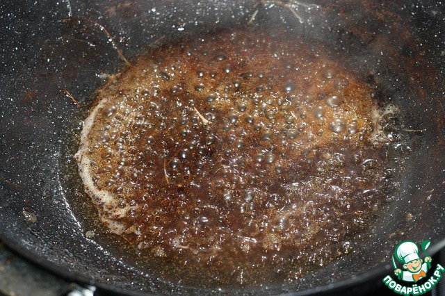Соус (если делаете несколько порций, то часть соуса) вылить на сковороду и немного выпарить. Сахар в соусе карамелизуется.