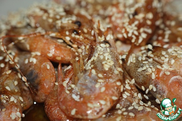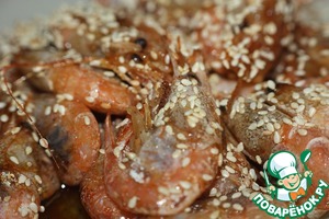Выложить креветок, полить соусом и посыпать кунжутом. Подавать теплыми.