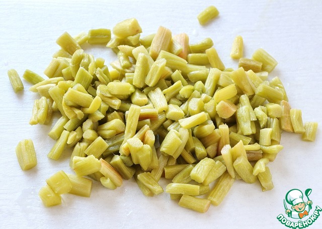 Если для выпечки кекса вы используете свежий ревень, то ревень вымыть, почистить от пленок и нарезать на кусочки примерно 1 см. Если вы используете замороженный ревень, то ревень необходимо разморозить и слить образовавшуюся жидкость. Я использовала замороженный ревень.
