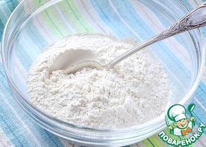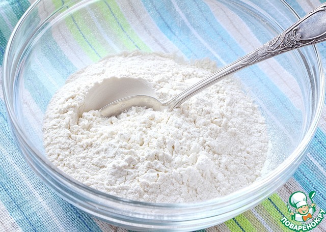 Смешиваем муку и разрыхлитель и просеиваем через сито, добавляем щепотку соли.